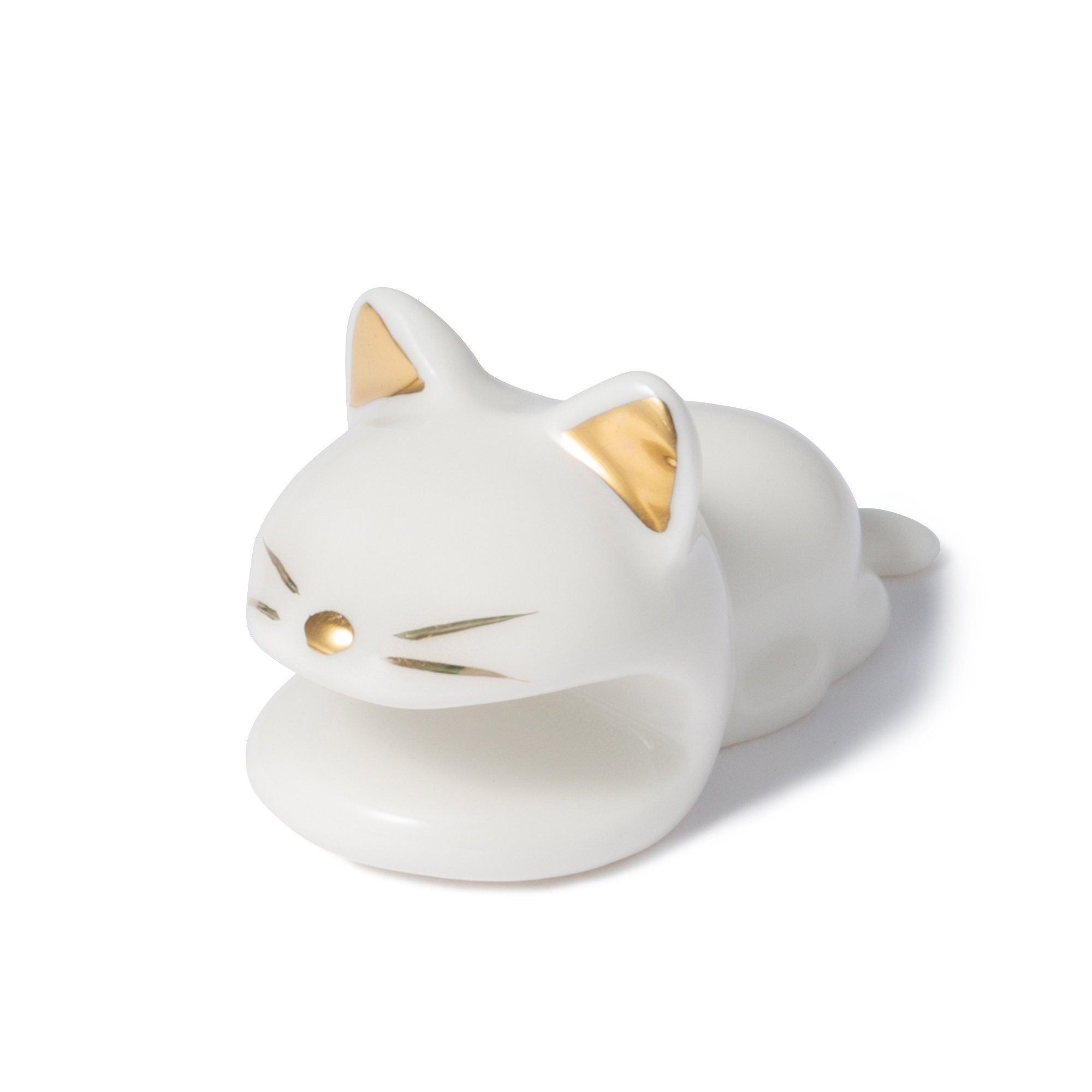 A chopstick rest with a cute cat shape and gold accents.