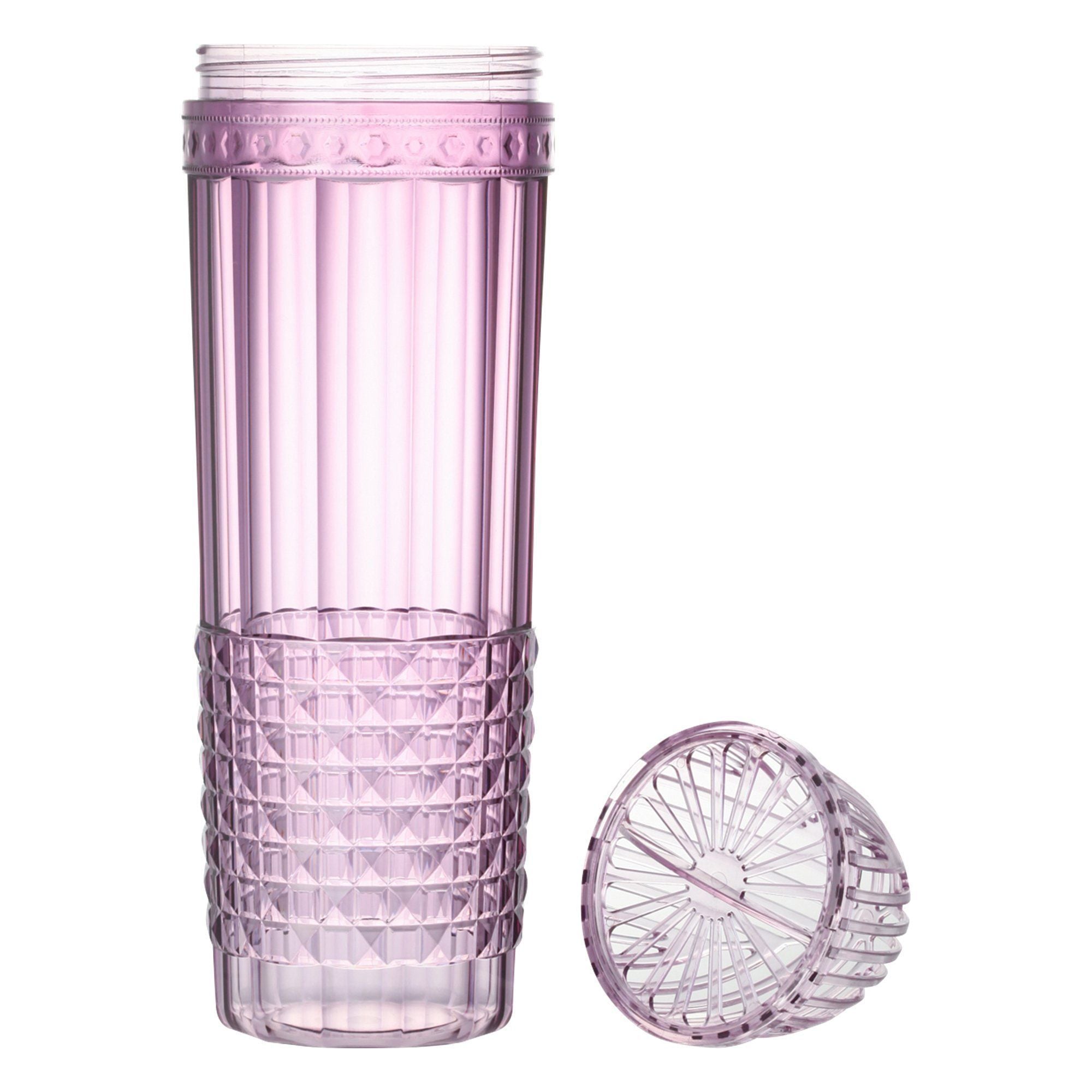 A pink tea bottle with fancy diamond cut design. Fit the shelf in the refrigerator perfectly, making it a great bottle for cold brew tea. The spout can be taken out for cleaning. It will definitely be an elegant addition to your space.Specifications