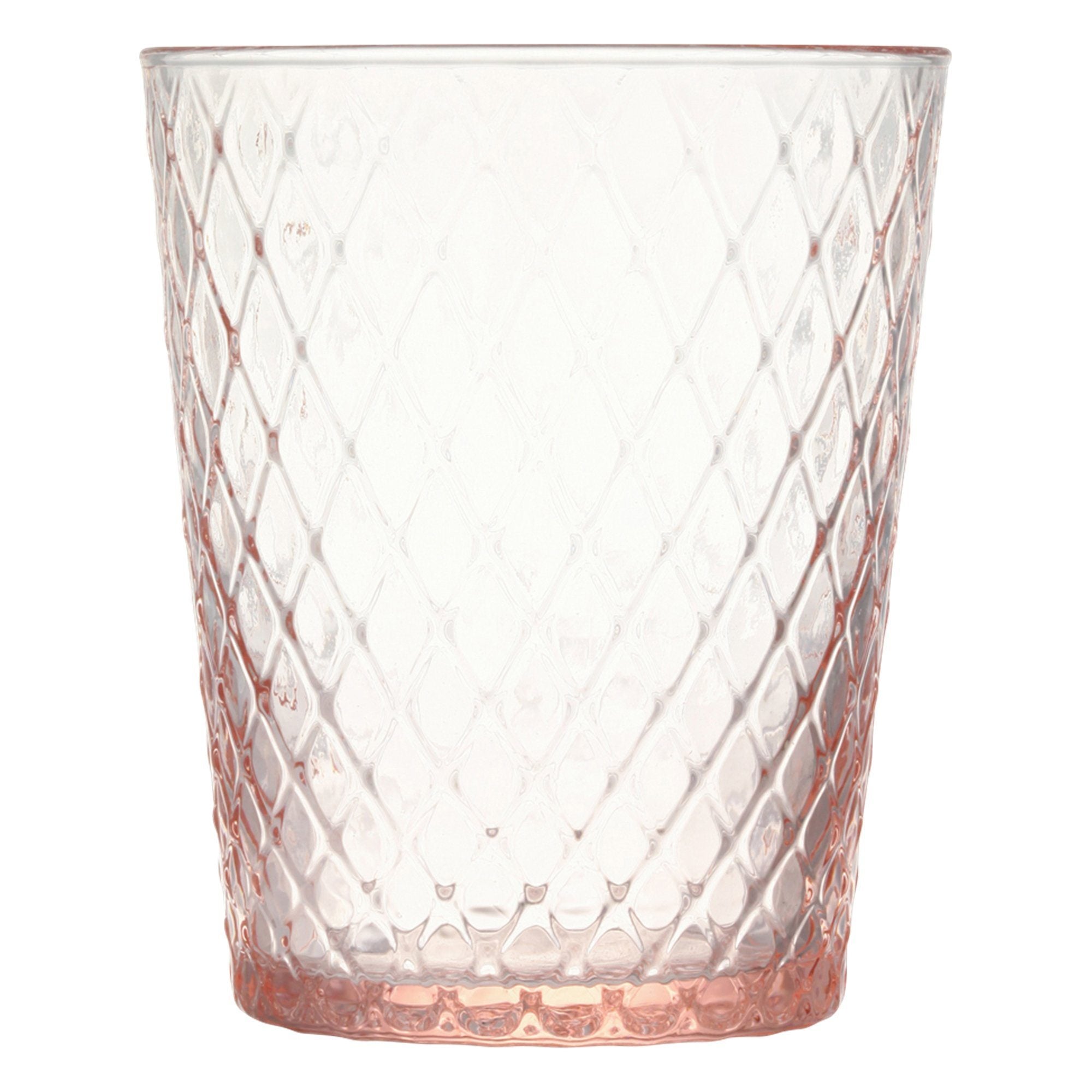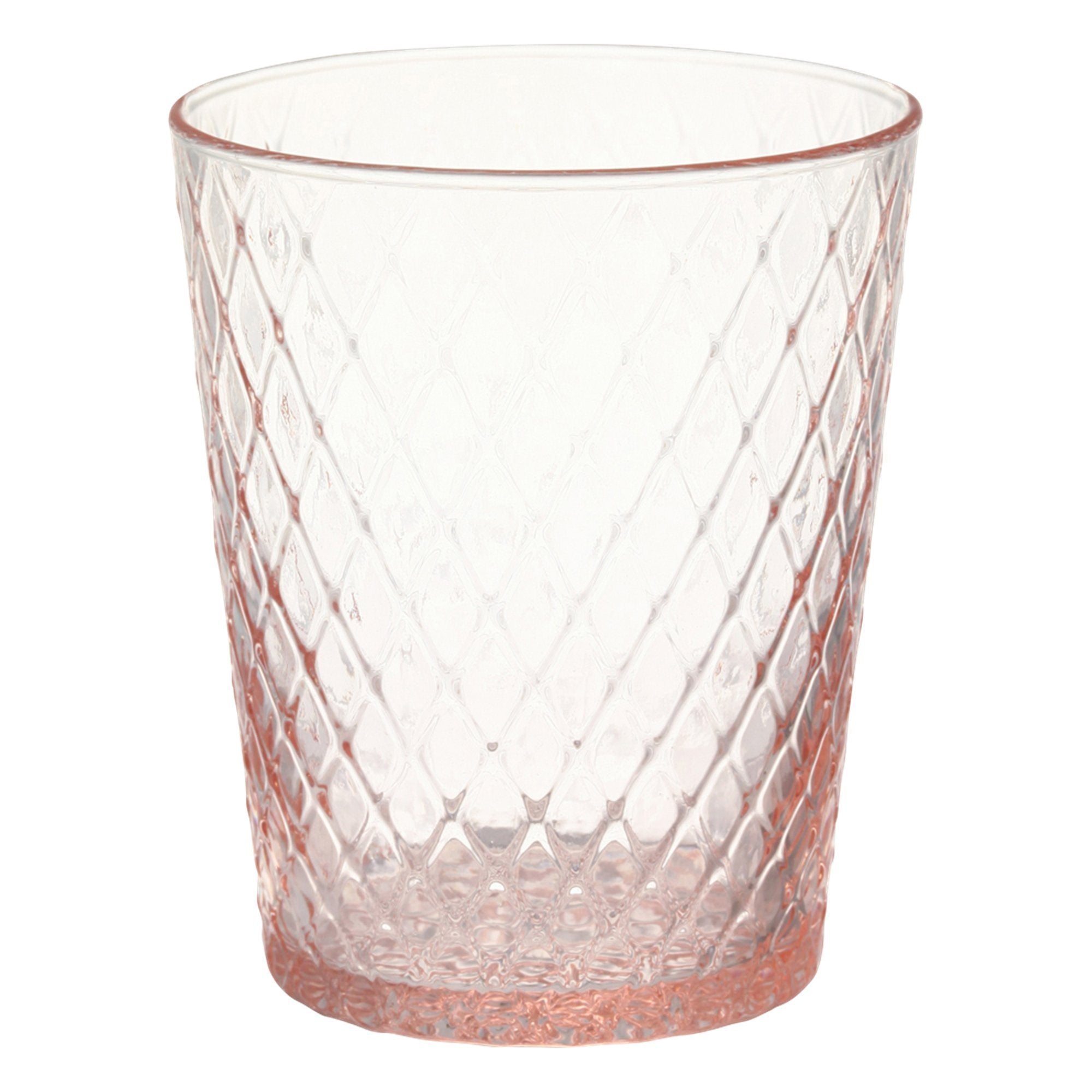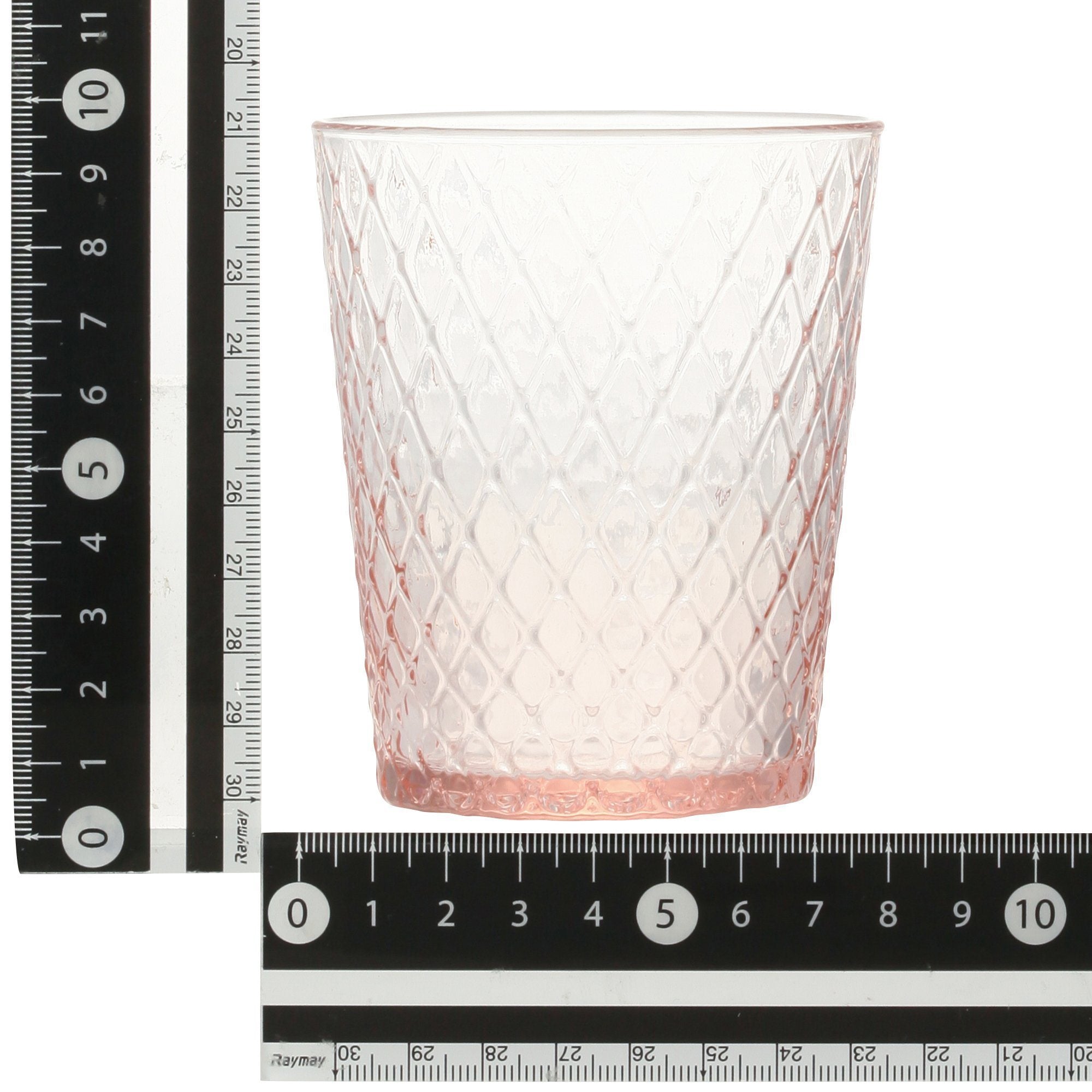 A fancy glass in pink. The unique diamond cuts and special design of the bottom make it shine brilliantly. Ideal for everyday use, keeping you in good mood for all day.Specifications