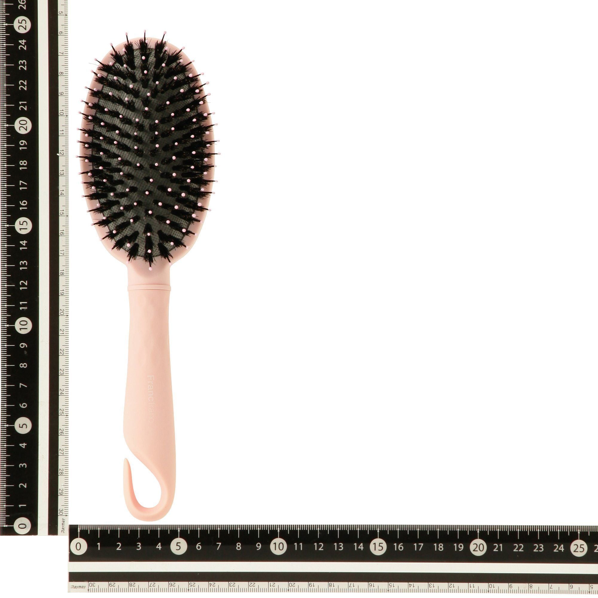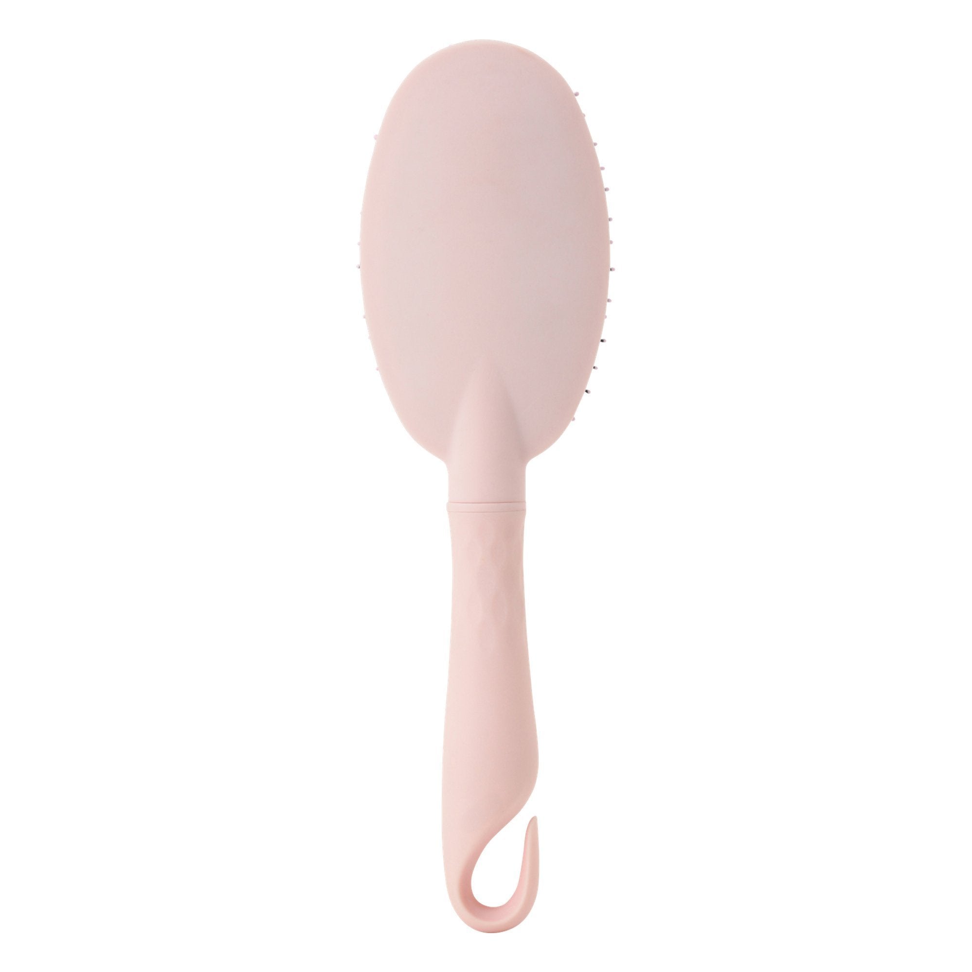 A matt pink hair brush with anti-static effect that can be used on dry or damp hair. The combination of nylon pins and boar bristles helps to detangle hair gently. The hook on the handle makes it space -saving. Gift box is included.Specifications