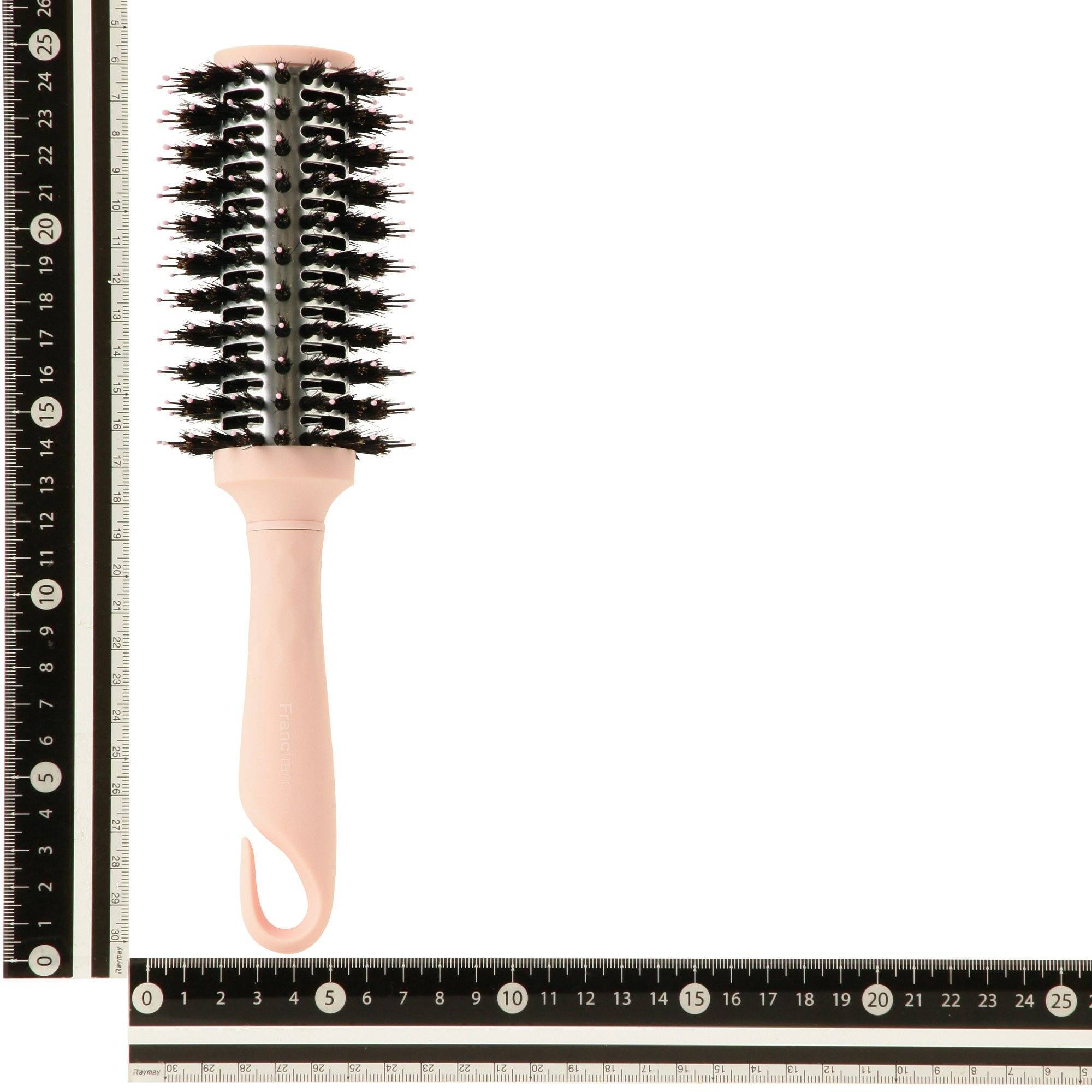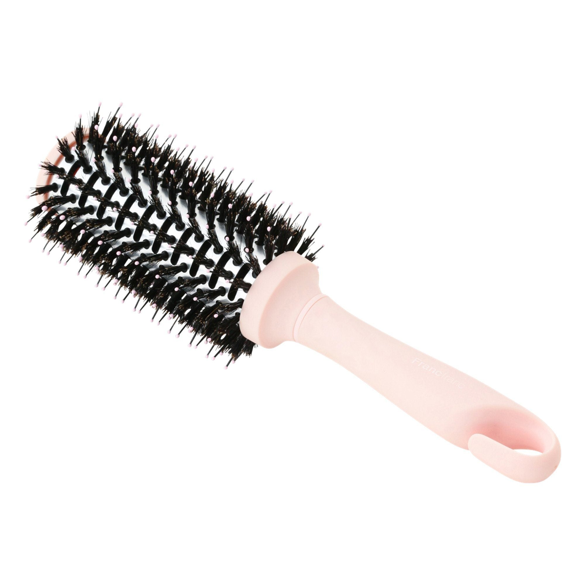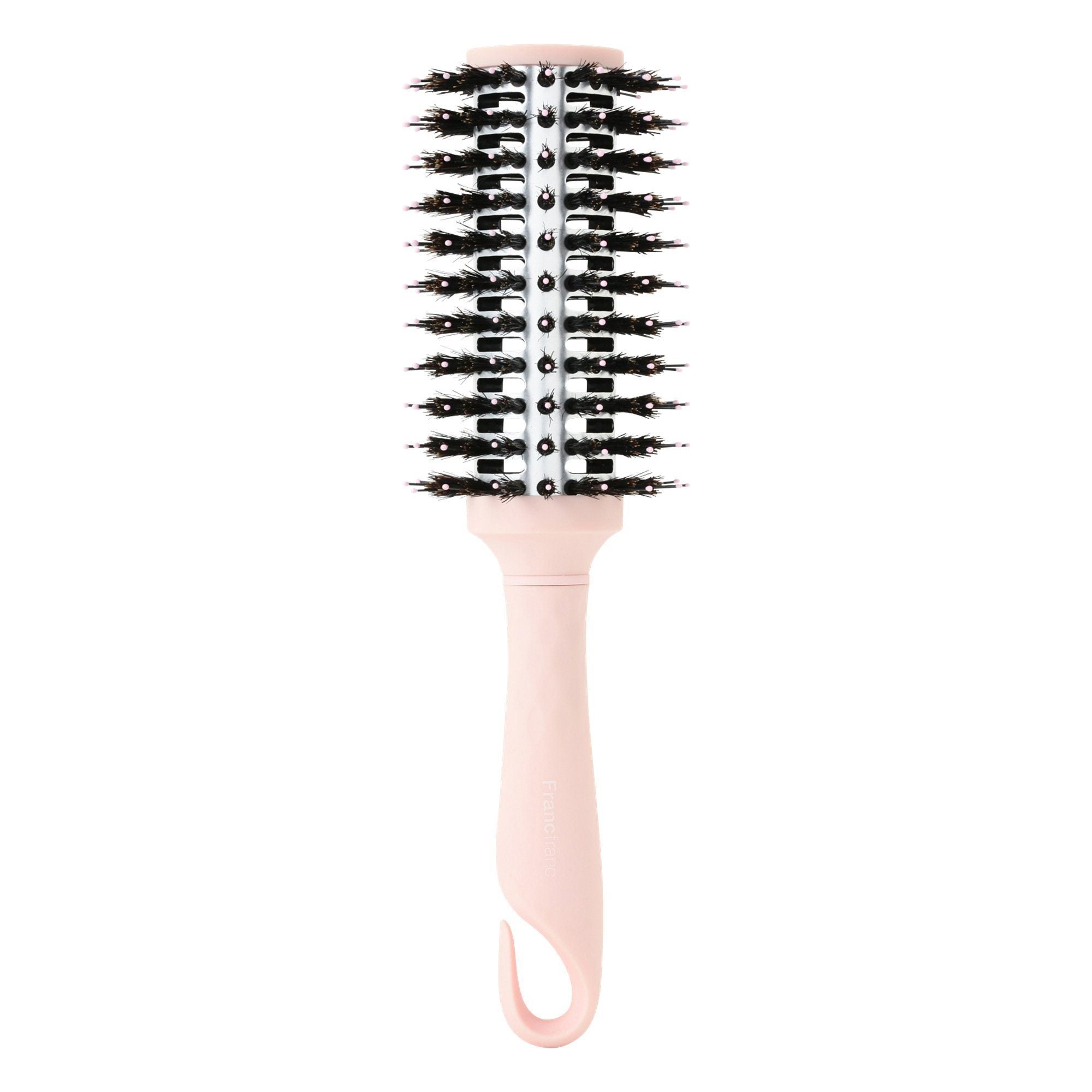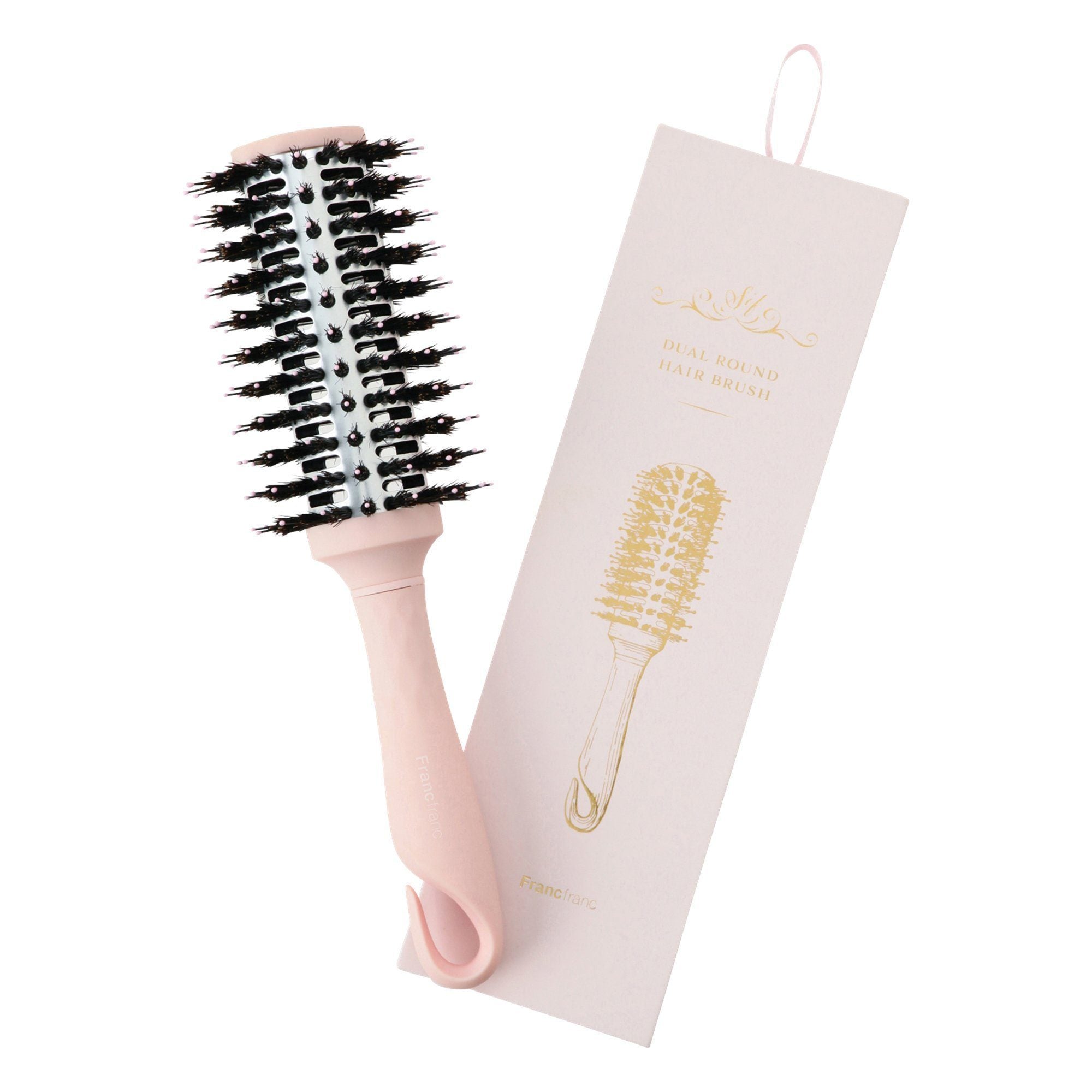 A matt pink hair brush with anti-static effect that can be used on dry or damp hair. The combination of nylon pins and boar bristles helps to detangle hair gently. The hook on the handle makes it space -saving. Gift box is included.Specifications