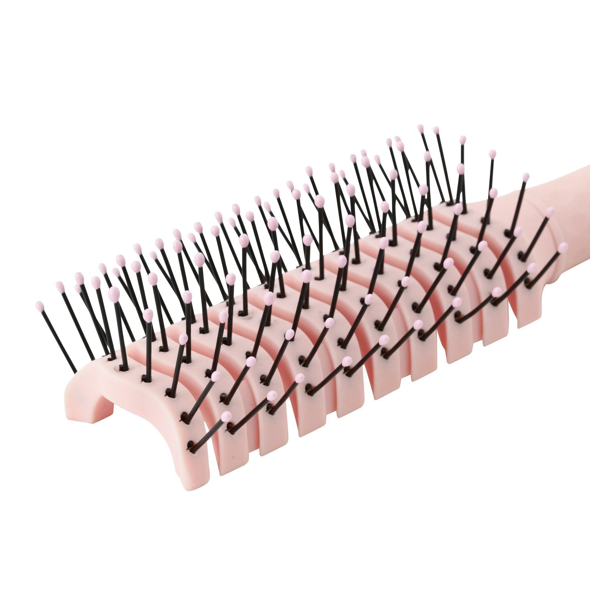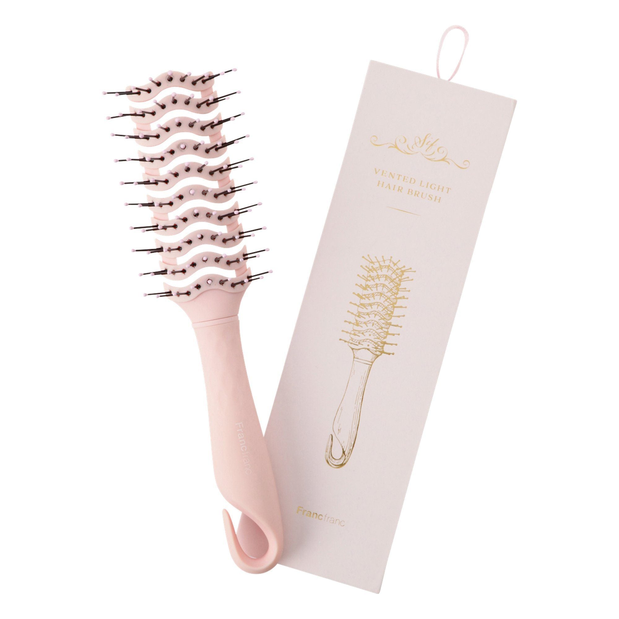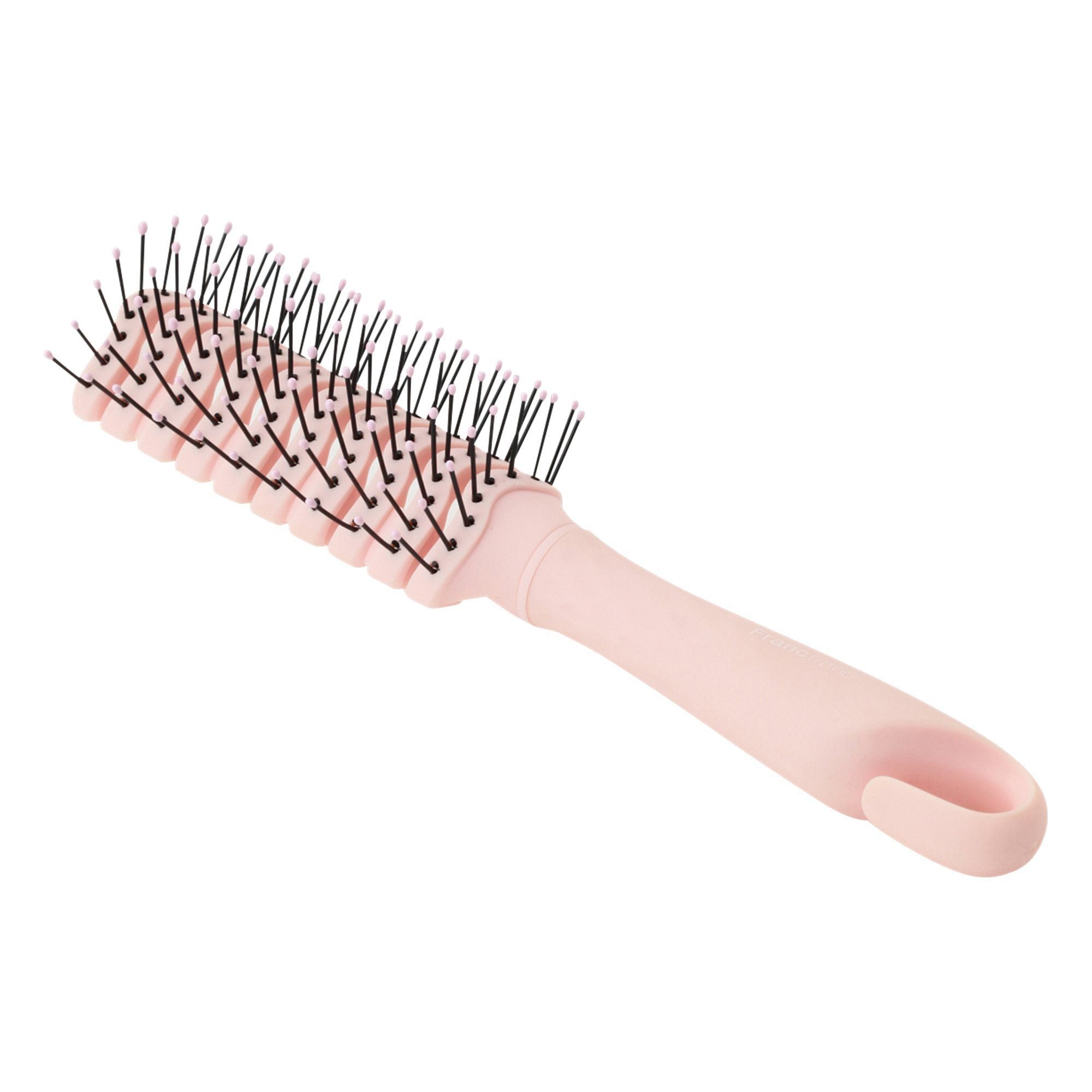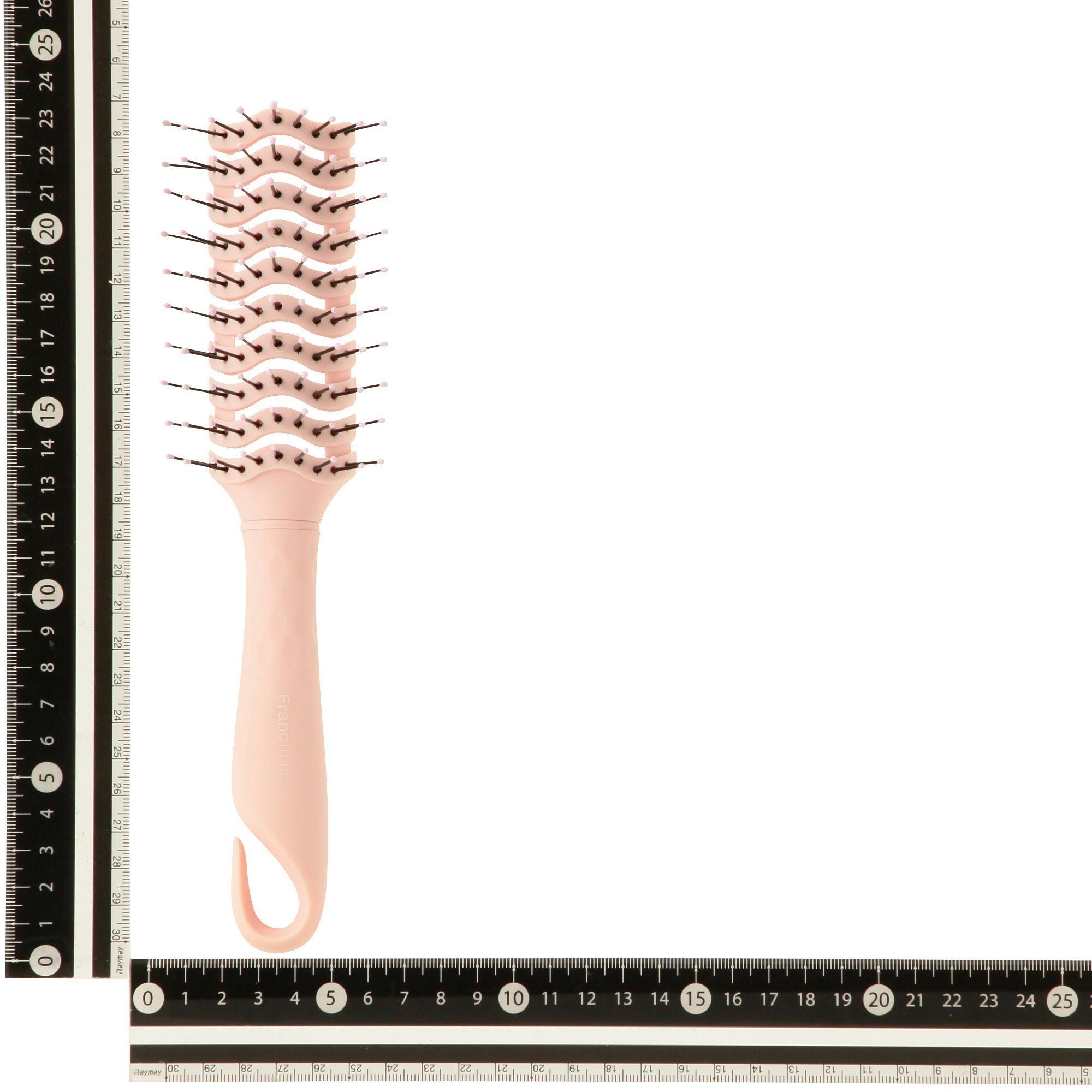 A matt pink hair brush with anti-static effect that can be used on dry or damp hair. Designed for permed hair. It also helps to detangle hair gently. The hook on the handle makes it space- saving. Gift box is included.Specifications