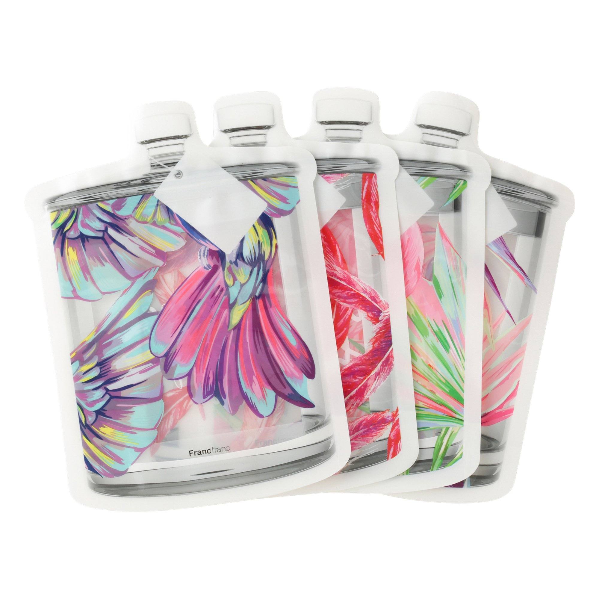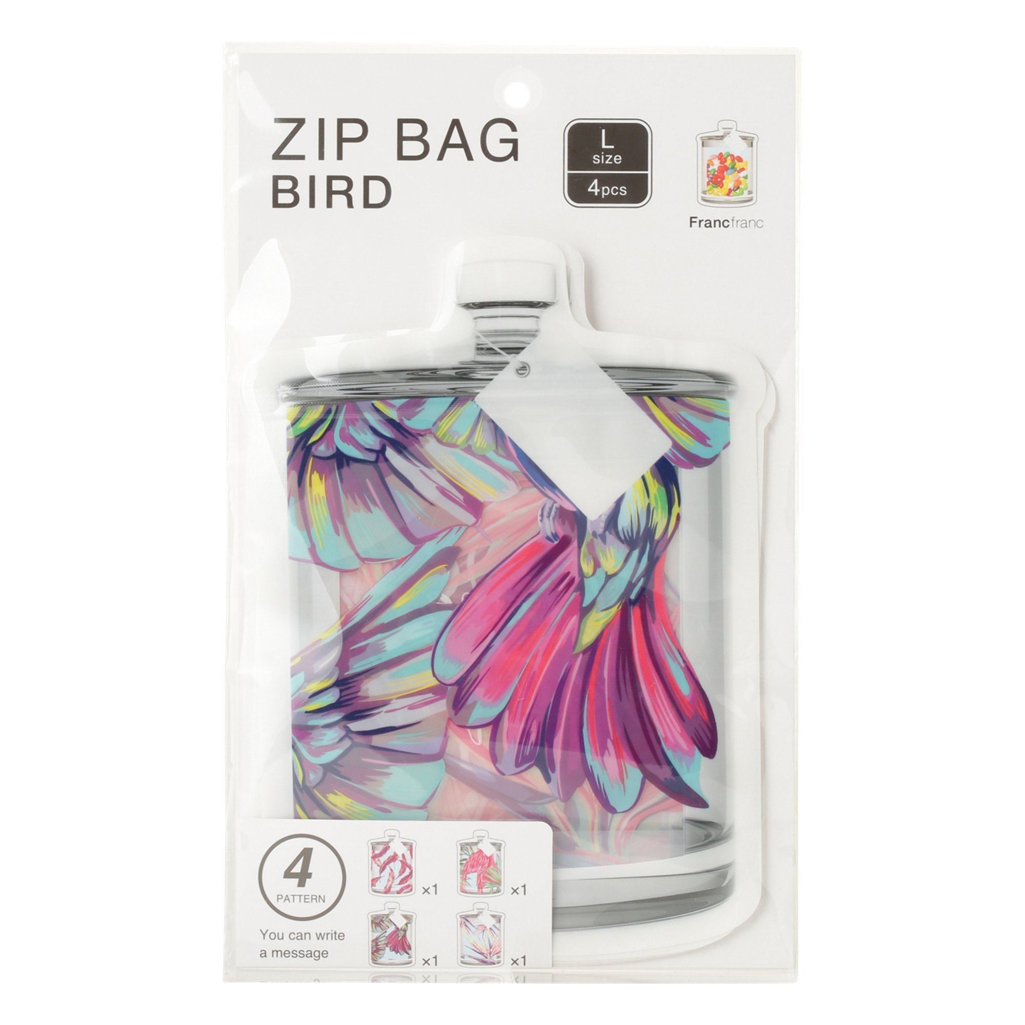A zip bag (sealable storage bag) designed with colorful bird wings in the motif of a glass jar. The tag part of the design is a specification that can be filled in the contents and messages. Assortment of 3 to 4 patterns included. In addition to food, it is also very useful for sorting medicines, accessories, cosmetics and other small items.Specifications